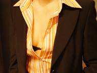 - die Bluse ist zu weit geöffnet, sodass man sogar den BH