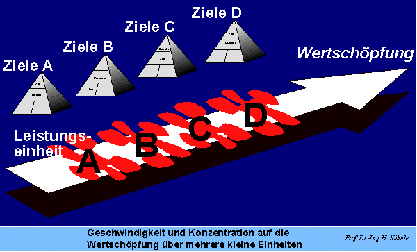 Als Lösung wurde das Konzept der Fraktalen Fabrik angesehen, weil es eine strikte Kundenausrichtung mit prozeßorientierten Strukturen ermöglicht und die Mitarbeiter in den Wandlungsprozeß einbezieht. Gemeinsam mit der Geschäftsführung wurde zu Projektbeginn eine Zielpyramide entwickelt und die Unternehmensstrategie visualisiert. Diese spiegelt insbesondere die Forderungen der Kunden bezüglich Flexibilität und Zeit wider. Das Konzept der Fraktalen Fabrik bietet die Möglichkeit nach den benannten Zielen zu strukturieren.