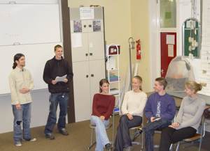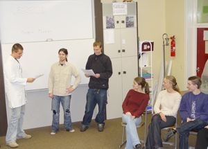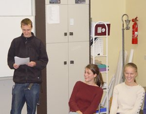 Auf der Bühne findet ein kurzer Dialog zwischen (M1) und (M2)