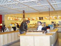 Er stellte seinen Becher auf den Tisch, ging danach zum Anfertigungstresen und machte