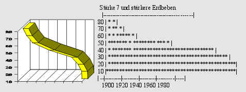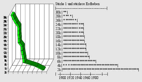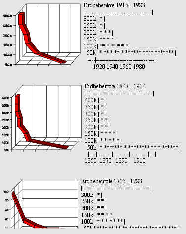 ![]() Vorgeschichte: Beispiel:Das große Erdbeben von Kanto Am 1.9.1923 um 11.58Uhr in Kanto die Erde.Das Beben hatte eine Stärke von 7,9 auf der Richterskala und riss mehr als 100.000 Menschen in den Tod. Die meißten von ihnen starben jedoch nicht in dem erdbeben selbst,sondern durch die nachfolgenden Brände. Dieser Tag ist noch heute ein Gedenktag an dem Katastrophenübungen stattfinden, der sogenannte "Katastrophentag" Auftreten: a) Gründe: ![]() ![]() ![]() ![]() Die Günde für das Auftreten von Erdbeben ist, dass nebeneinanderliegende Erdplatten aneinander stoßen, sich übereinander oder aneinander vorbei schieben.Die Verschiebungen erfolgen meist ruckartig. An der Nahtstelle der Platten baut sich infolge der Reibungskräfte eine Spannung auf. Sobald diese Spannung eine bestimmte Größe überschreitet, findet ein plötzlicher Ausgleich statt: die beiden Platten verschieben sich in einem einzigen Ruck, die Erde bebt.Passiert dies, so entstehen Verwerfungen(z.B. San Andreas-Verwerfung in Kalifornien/Amerika). Japan ist gerade deswegen ein erdbebengefärdetes Gebiet, da dort 4 Erdplatten(Eurasische Platte,Phillipinische PlattePazifische Platte und Nordamerikanische Platte) aufeinanderstoßen und es deshalb häufig zu Erdbeben kommt. Richtig katastrophal wird es aber erst dann, wenn sich vertikale ind horizontale Bodenbewegungen kombinieren. Da dann das Ausmaß der Zerstörung eine unheimliche Größe annimmt.Beispiel dafür, das Beben in der Kansai-Region: 20-sekündiges Hauptbeben,500 Nachbeben,5502 Tote,32929 Verletze,314169 Obdachlose und 208150 zerstörte Gebäude. Folgen: a)unmittelbare: Die Folgen von Erdbeben sind für Millionen von Menschen sehr schlimm.Oft fangen zu den oben genannten Gründen auch noch Plünderungen an und es werden Gerüchte zersteut. Dadurch widerum kommt es bei den nervlich zerstörten Menschen zu Auseinandersetzungen zwischen,z.B. verschiedenen Religionsgruppen. Die Folge dadurch:Noch mehr Verletzte und Tote. Zudem noch der große Materialschaden! Bei ERdbeben werden nämlich ca. 50% der Häuser durch ERschüterungen, aber auch die vielen Brände tragen zum Einstürzen bei.Bei solchen Katastrphen kann der Gesamtschaden bis zu 5 Millionen Yen betragen. b) soziale und politische Folgen: Die schwerwiegenste soziale Folge ist der gesellschaftliche Bruch!Durch die vielen Obdach-und Wohnungslosen, die kein Geld haben, sich eine neue Bleibe zu suchen,gewinnt der Nationalismus oft an Bedeutung(ein sehr gutes Beispiel dafür:Das Beben der Kansai-Region),da der Liberalismus für die wirtschaftlichen und sozialen Probleme keine Lösung anbietet. Wenn der Extremfall eintritt, dann kommt es bei der linken Gruppe zur Radikalisierung. Nach ganz schweren Erdbeben werden die Japaner meißt aus dem Ausland finanziell und materiell unterstützt. Außerdem kann ein enormees Handelsdefizit durch die zusätzliche Nachfrage nach ausländischen Gütern aufkommen. Zudem tritt oft ei9n sehr schlechter Börsenkurs ein. ![]() Maßnahmen: a) Bauweise: Seit jeher sind die Japaner auf Erdbeben eingestellt. Anfangen tut dies schon mit einer ganz bestimmten Bauweise der Häuser. Anstatt Hochhäuser für die Menschenmassen, die in Japan leben, zu bauen, werden Holzhäuser mit nur 1 oder 2 Stockwerken gebaut, da so das Risiko geringer ist, das diehäuser einstürzen oder das so zumindest die Schäden bei einem solchen Falle gesengt werden. Holz wird verwendet, da es die Schwingungen eines Bebens wesentlich flexibler abfangen kann, als das starre Gestein. Die inzwischen in Bauschriften vorgeschriebenen Sicherheitstechniken, die sich durch Stahlrahmenkonstruktionen und Verankerungen auszeichnen, sollen jetzt auch Hochhäuser schützen. b) Vorhersagen und Bevölkerungsschulung: Die Bevölkerung wird schon sehr lange geschult. Angefangen hat dies schon mit dem Katastrophentag, an dem 13 Millionen Menschen teilnahmen. Dort wurde ihr Wissen über das Verhalten bei Erdbeben aufgefrischt und Schutzmaßnahmen geübt. Erstklässler mussten ihre Erdbebenschutzklappen aufsetzen, die Beamten und Unternehmer machten Übungen in den Frühstückspausen und Hausfrauen und Kinder kamen zu Aufführungen der Polizei und der Feuerwher in die Parks. Aber nicht nur die die Menschen mußten lernen sich zu schützen. Es wurden auch staatliche Einrichtungen errichtet. Krankenhäuser, Feuerwehr und Hilfsdienste müssen in ständiger Bereitschaft sein, die Gemeinde muss Evakuierungszentren bauen, es dürfen keine öffentlichen Verkehrsmittel mehr fahren und Gas und Strom werden zum Schutz der Bevölkerung ausgeschaltet.