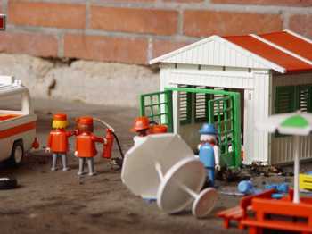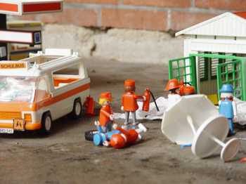 Inferno an der Tankstelle![]() Ein ganz normaler Tag an einer Tankstelle: Wie immer an einem Samstagmorgen drängeln sich die Busse und PKWs, um für die Wochenendausflüge zu tanken. In der Werkstatt wird ein Motorrad repariert. Am Kiosk gibt es Hot Dogs, Fisch - und Feuerlöscher im Sonderangebot. Gerade als der Schulbus losfährt, schießt eine Stichflamme aus der Werkstatt hervor, die durch ausgelaufenes Benzin entstanden ist. ![]() Der Schulbus gerät ins Schleudern und prallt gegen einen