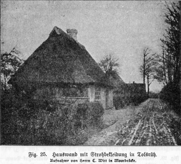 "...1975 verkauften die Eheleute Paulsen Haus und Hof in Tolsrüh und zogen nach Flensburg. Im Wohnhaus lebt heute Familie Hebeler und das Land hat Gerd Feige gekauft. In dem Haus, das um 1790 gebaut worden ist, hat sich nach Aussagen einiger älteren Looser früher ein Alkoholausschank befunden. Durch ein kleines Fenster zwischen Flur und Stube, das auch heute noch vorhanden ist, wurden die Kunden bedient. Zu jener Zeit, als die Männer des Dorfes noch zum Torfstechen ins Moor gingen, war es durchaus üblich, eine Flasche Korn mitzunehmen, die zuvor hier, am Rande des Moores gekauft wurde." |
